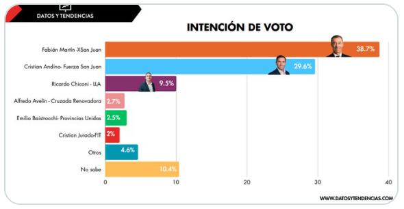 Rumbo a las elecciones del 26 de octubre, el candidato Fabián Martín, de Por San Juan, se quedaría con el 38,7% de los votos, en tanto que el peronista Cristian Andino, de Fuerza San Juan, obtendría el 29,6% de los sufragios.
