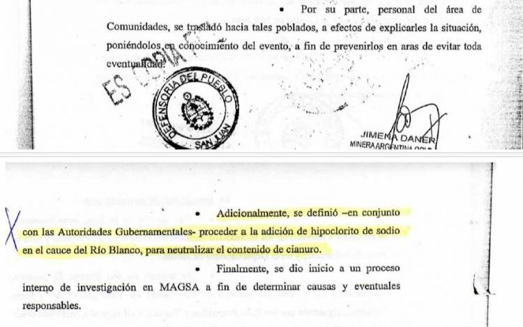 En ese contexto, la empresa Barrick Gold reconoció haber utilizado hipoclorito de sodio, una forma de cloro, para encapsular y neutralizar el cianuro en el cauce del río Blanco. Esto quedó asentado en un escrito presentado ante el Defensor del Pueblo de San Juan por la abogada Jimena Daneri, en representación de MAGSA, donde detalla que se procedió a “la adición de hipoclorito de sodio en el cauce del río Blanco”.