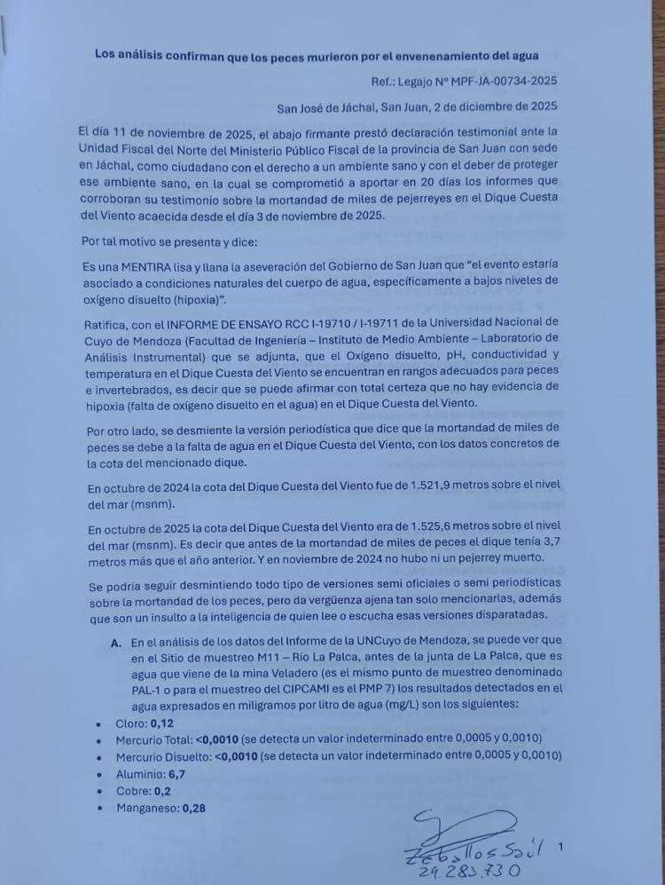 Es importante aclarar que los análisis adjuntados como prueba ante la Fiscalía de Jáchal, en el legajo Nº MPF-JA-00734-2025, son producto de las muestras que se tomaron el día 7 de noviembre por la UNCuyo.
