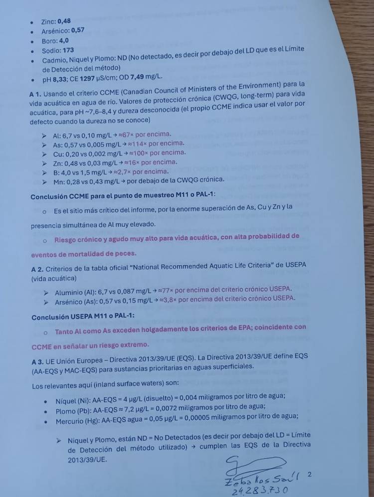 Además, estamos seguros que hubo un nuevo derrame ocultado en noviembre de 2025 porque en el Río La Palca, que viene de la mina Veladero, se detectó 0,12 miligramos de cloro por litro de agua, y el Hipoclorito de Sodio (una especie de cloro) es utilizado por Barrick Gold para neutralizar el contenido de cianuro en el río cuando se produce un derrame en la mina Veladero.