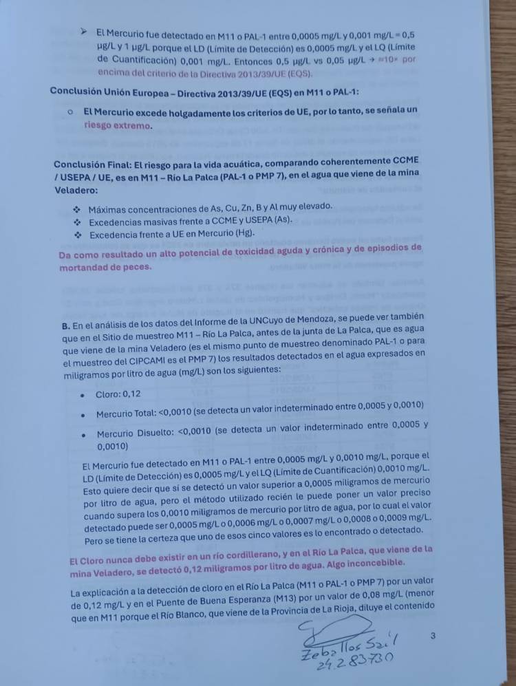 De acuerdo a los análisis, los valores detectados de mercurio el 7/11/2025 en el punto de muestreo PAL-1 (M11) en el río La Palca (120 km. río abajo de la mina Veladero) coinciden con los detectados el día 16/09/2015, en el mismo punto de muestreo, cuando se produjo la contaminación con mercurio provocada por la Barrick Gold en el primer derrame de la mina Veladero ocurrido el 12 y 13 de septiembre de 2015.