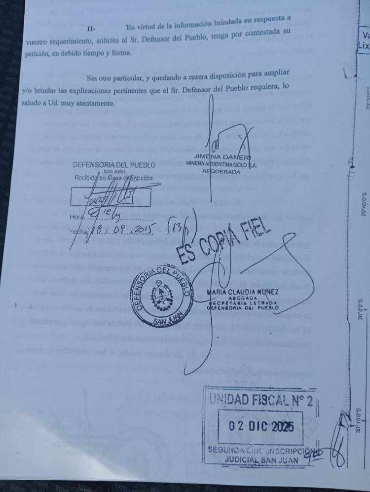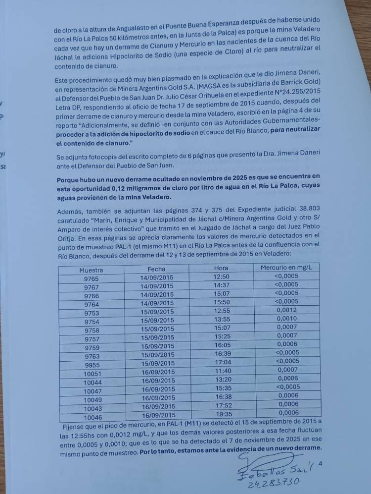 La Asamblea Jáchal No Se Toca informa que en el día de la fecha presentó a la Fiscalía de Jáchal en el Legajo N° MPF-JA-00734-2025, el informe de la UNCuyo de Mendoza con los resultados de los análisis de agua realizados el día 7 de noviembre de 2025 y se adjuntó documentación del derrame de la mina Veladero de septiembre de 2015, lo que permite asegurar que hubo otro derrame ocultado en noviembre de 2025.