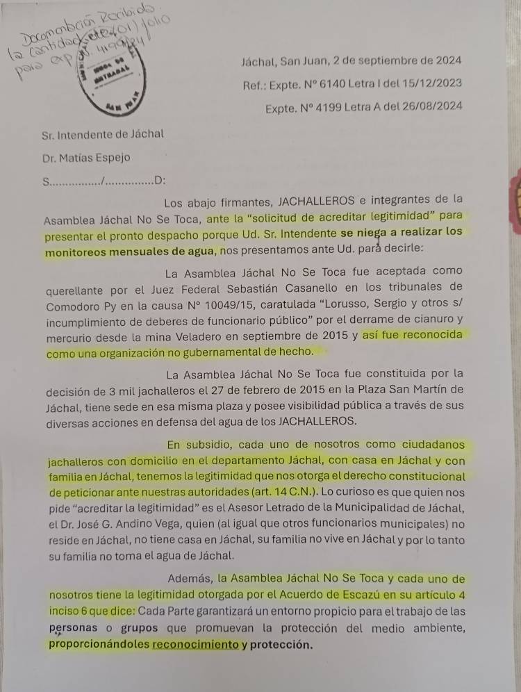 Los abajo firmantes, JACHALLEROS e integrantes de la Asamblea Jáchal No Se Toca, ante la “solicitud de acreditar legitimidad" para presentar el pronto despacho porque Ud. Sr. Intendente se niega a realizar los monitoreos mensuales de agua, nos presentamos ante Ud. para decirle: