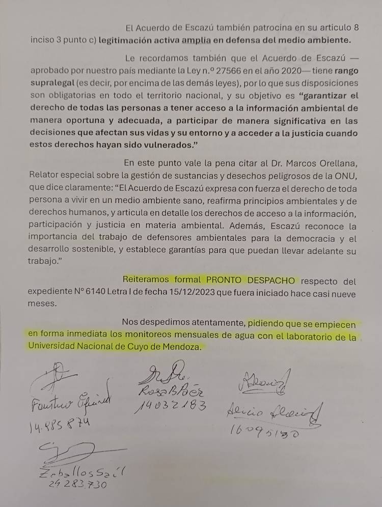 Nos despedimos atentamente, pidiendo que se empiecen en forma inmediata los monitoreos mensuales de agua con el laboratorio de la Universidad Nacional de Cuyo de Mendoza.