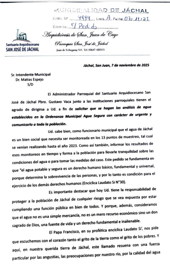 En el Expediente Nº 4994 – A, de fecha 7 de noviembre de 2025, el Administrador Parroquial del Santuario Arquidiocesano San José de Jáchal, Presbítero Gustavo Vaca, junto a las instituciones parroquiales solicitaron que en forma urgente el Intendente Marías Espejo haga los análisis de agua que establece la Ordenanza “Agua Segura” en Jáchal.