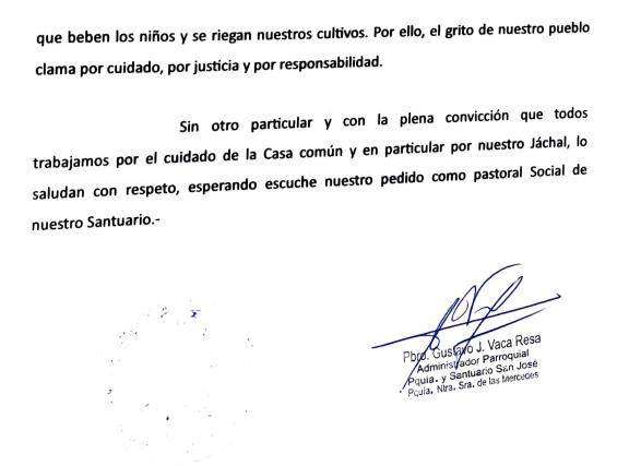 “Usted sabe bien, como funcionario municipal que el agua de Jáchal es un bien social que necesita ser monitoreado en los 13 puntos de muestreo, informar los resultados de esos monitoreos en tiempo y forma a la población para llevarle tranquilidad sobre las condiciones del agua o para tomar las medidas del caso. Este pedido se fundamenta en que “el agua potable y segura es un derecho humano básico, fundamental y universal, porque determina la sobrevivencia de las personas, y por lo tanto es condición para el ejercicio de los demás derechos humanos (Encíclica Laudato Sí Nº 30)”.
