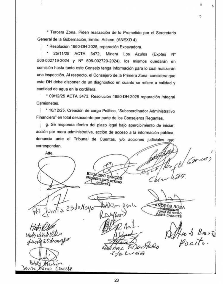 Juntas de riego de 25 de Mayo, Chimbas, Rawson, Caucete, Pocito, Calingasta, Angaco, Sarmiento, Jáchal, entre otros y Productores agrícolas de San Juan, realizaron una presentación de 32 páginas, ante el Ministerio de Infraestructura, Aguan y Energía de la provincia de San Juan, a cargo de Fernando Perea, para que remita informes al respecto de varios temas que cita el escrito presentado.