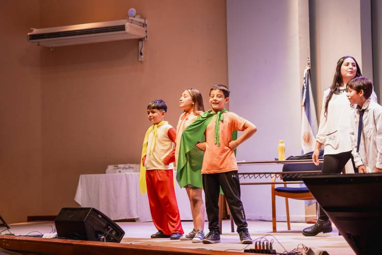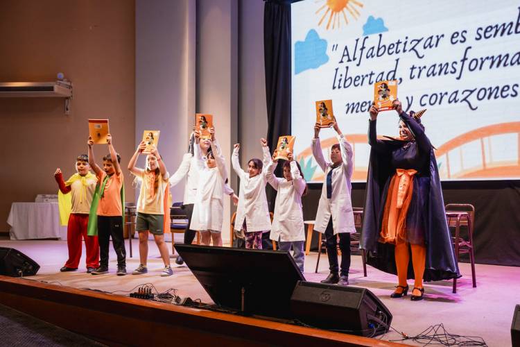 A través de una representación con música y narración, los alumnos, una docente, una “bruja malvada” y niños súper héroes interpretaron cómo las palabras pueden transformar la vida de las personas y conectar el aula con el mundo, reflejando el espíritu del plan que atraviesa todos los niveles educativos de la provincia.