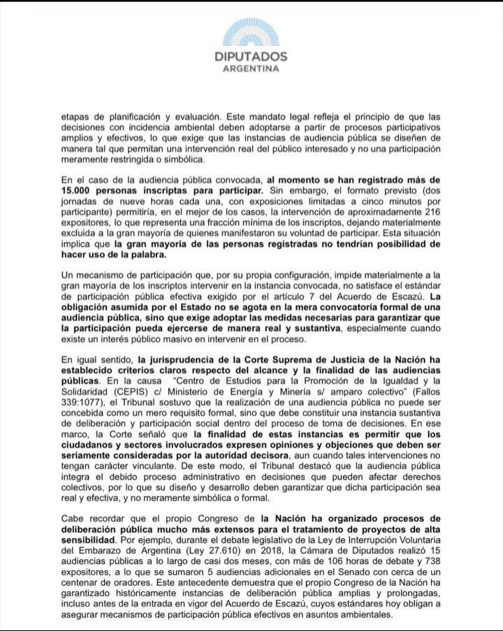 “Solicitamos que se disponga la ampliación de la audiencia pública a fin de asegurar una participación ciudadana efectiva y acorde con los estándares establecidos por el Acuerdo de Escazú”, señalaron en la presentación.