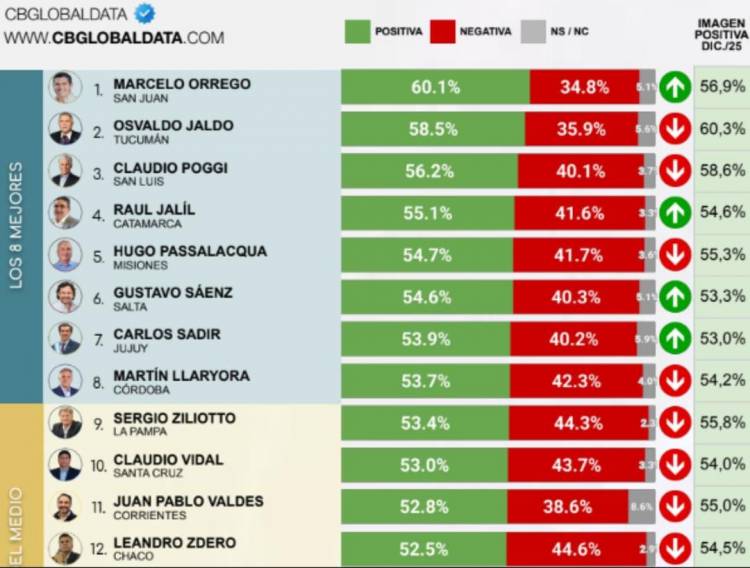 Los 5 gobernadores mejor valorados durante febrero de 2026 por los ciudadanos de cada provincia son: Marcelo Orrego, de San Juan, con un 60,1% de imagen positiva, liderando el ranking elaborado por CB Global Data.