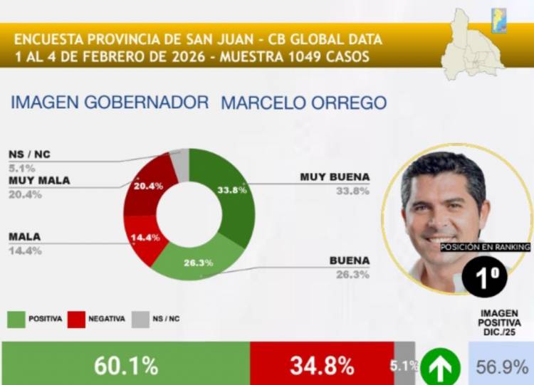 Según CB Global Data, que difundió una encuesta de ranking de gobernadores realizada en febrero de 2026, el Gobernador de San Juan, Marcelo Orrego, se ubicó en primer lugar entre los mandatarios con mejor imagen de todo el país.