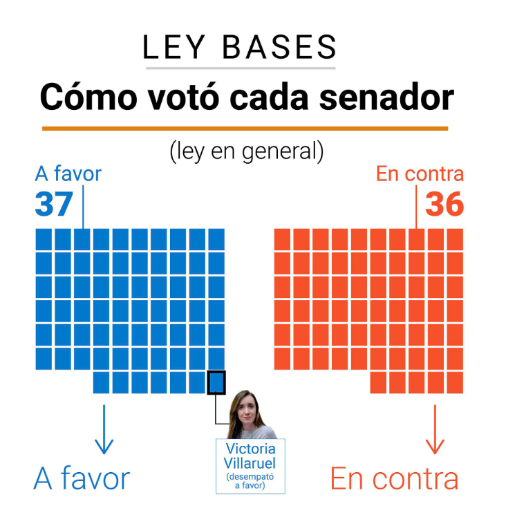 Luego de una primera votación donde se obtuvieron 36 votos afirmativos y 36 votos negativos, se reiteró la votación obtenido el mismo resultado, de manera que Villarruel fue quien definió la aprobación de la Ley Bases.